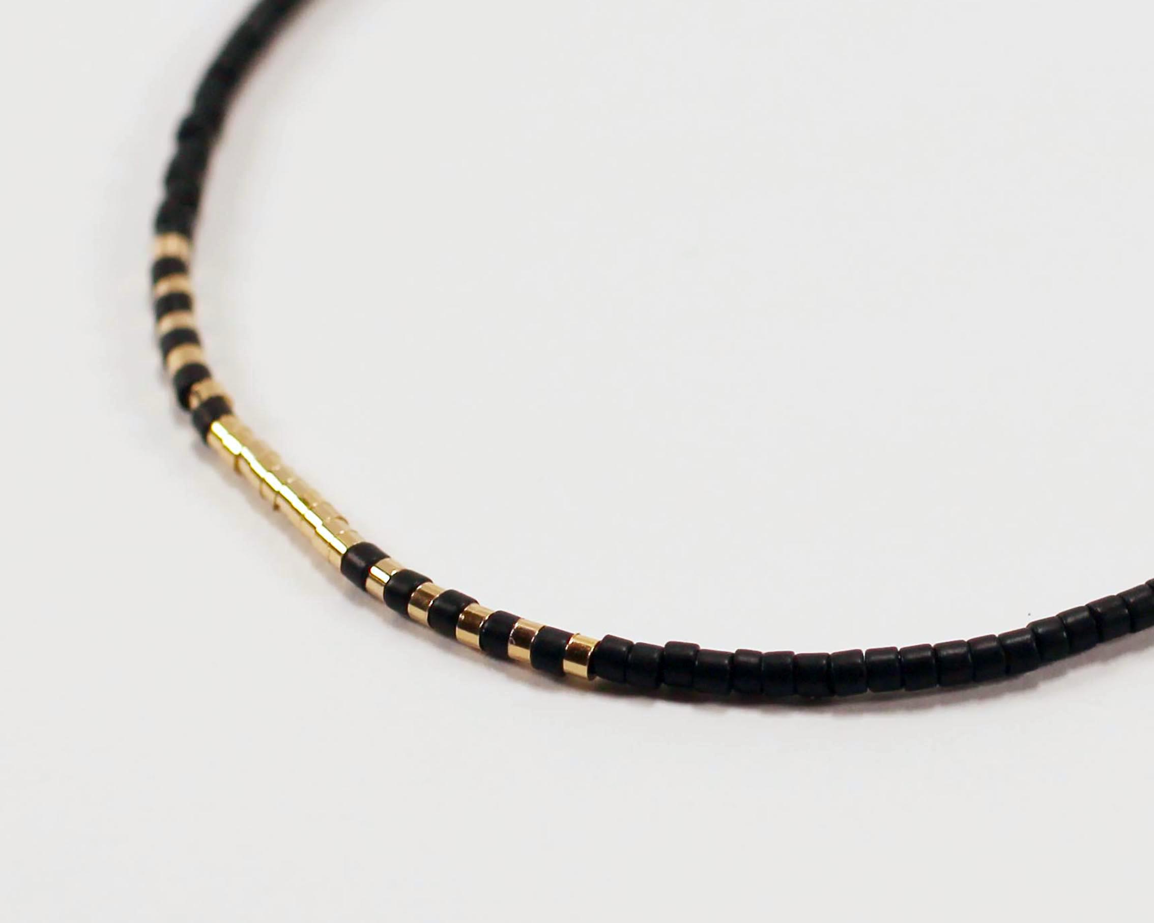 Protože černá je dobrá a navíc prudce elegantní a nadčasová. Náramek s japonskými skleněnými korálky v černém matu a s promyšlenými detaily z korálků z plněného/plátovaného zlata* 14 kt. Nylonový provázek se splétaným "zámečkem" pro nastavení velikosti.