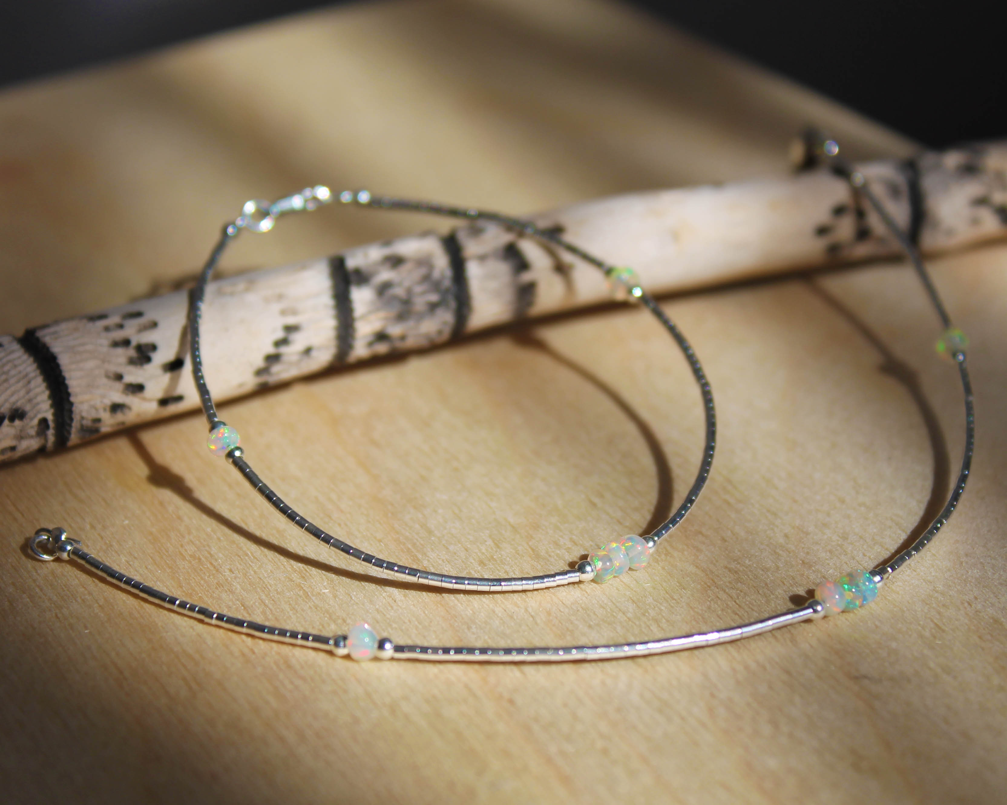 Oslňující náramek, který upoutá svou křehkostí vzhledu s nádhernými opály z Etiopie, které hýří barvami, když si s nimi pohrávají paprsky světla. Náramek je vyroben ze stříbrných komponentů (925/1000), které jsou navlečeny na transparentním lanku ze 7 vláken pro velkou pevnost. Délka náramku je standardně 16,5 cm, ale může být i kratší/delší, vše je na domluvě.