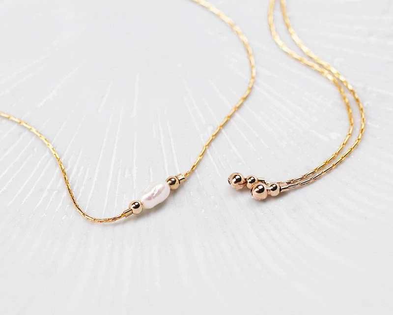 Řetízkový náhrdelník z plněného/plátovaného zlata* s kultivovanou říční perličkou. Celková Délka nárdelníku je 65 cm a způsob nošení /délku/ velmi jednoduše určujete posuvným korálkem se silikonem uvnitř.