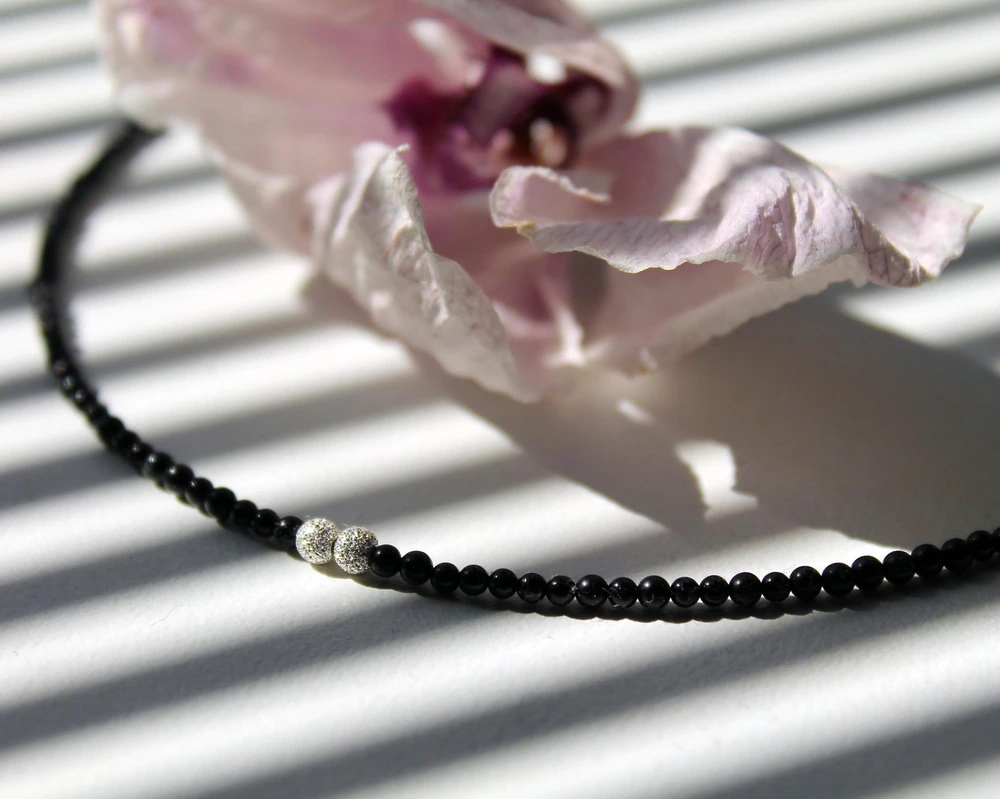 Elegantní náramek s korálky z černého onyxu a dvěma pískovanými třpytivými stříbrnými korálky. Stříbrné komponenty jsou ze stříbra 925/1000. Vše je nalvečeno na lanku se zapínáním na malinkou karabinku. Délka náramku je standardně 16,7 cm, ale může být i kratší/delší, vše je na domluvě. Stačí když napíšete do poznámky v objednávce.