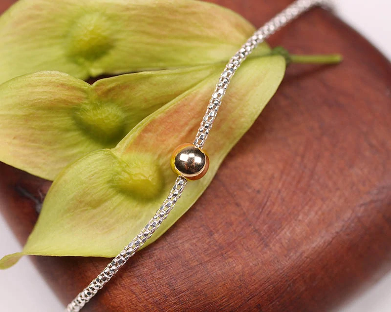 Náramek ze stříbra 925/1000 s posuvným korálkem z plněného/plátovaného* zlata. Délka náramku od jednoho konce ke druhému je 17,5 cm a zapíná se na malou karabinku.