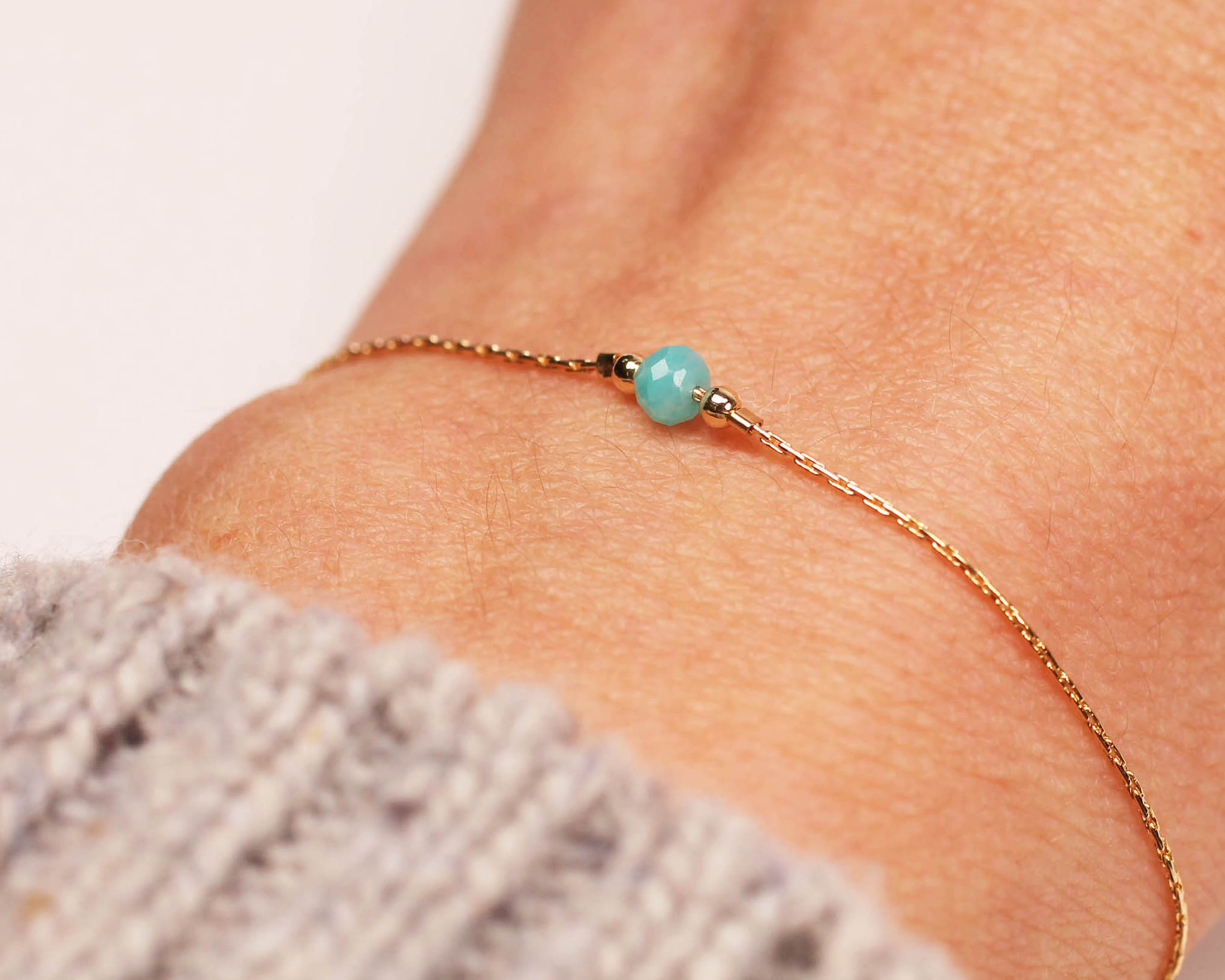 Řetízkový náramek z plněněného/plátovaného* zlata s malým tyrkysovým minerálem amazonit. Velikost náramku se velmi jednoduše určuje posuvným korálkem se silikonem uvnitř.