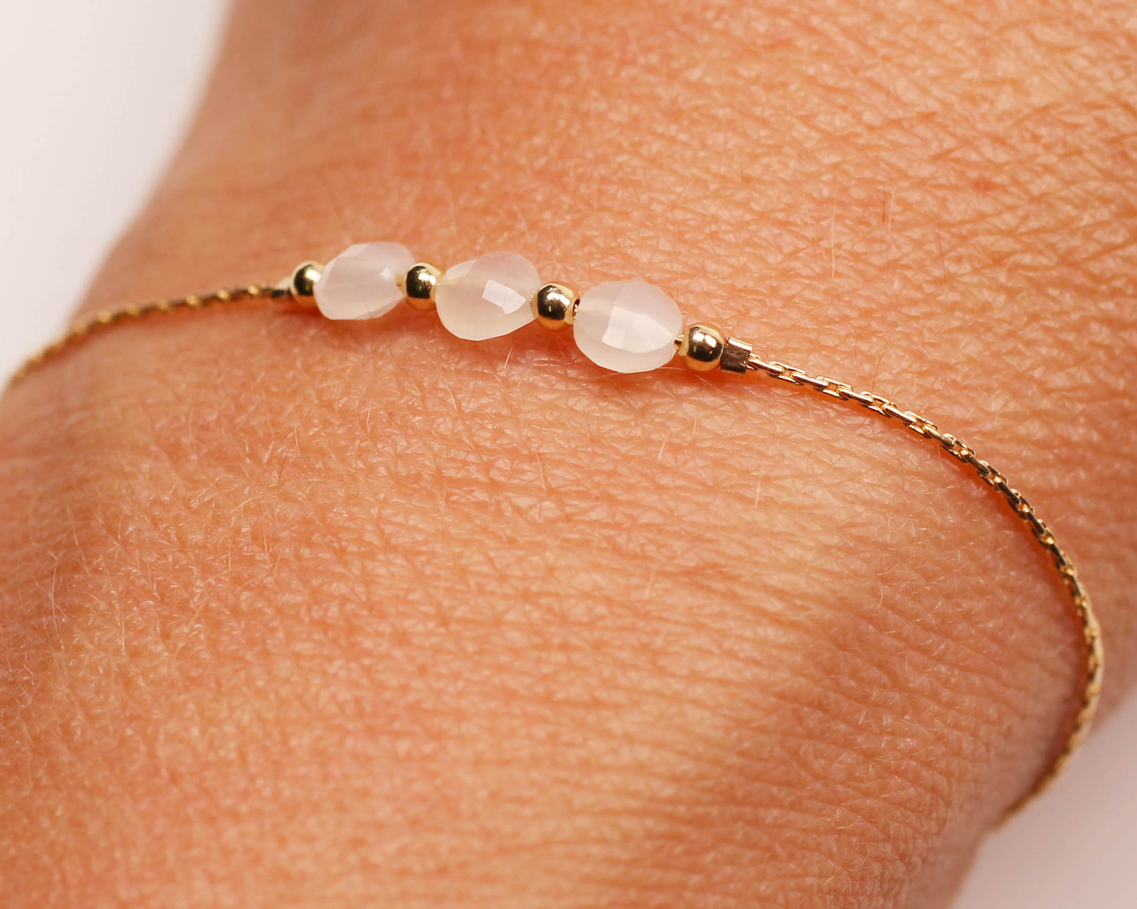 Elegantní náramek s trojicí broušených měsíčních kamenů. Všechny ostatní komponenty jsou z plněného/plátovaného* zlata. Velikost náramku se velmi jednoduše určuje posuvným korálkem. Délka náramku od jednoho konce ke druhému je 22 cm.
