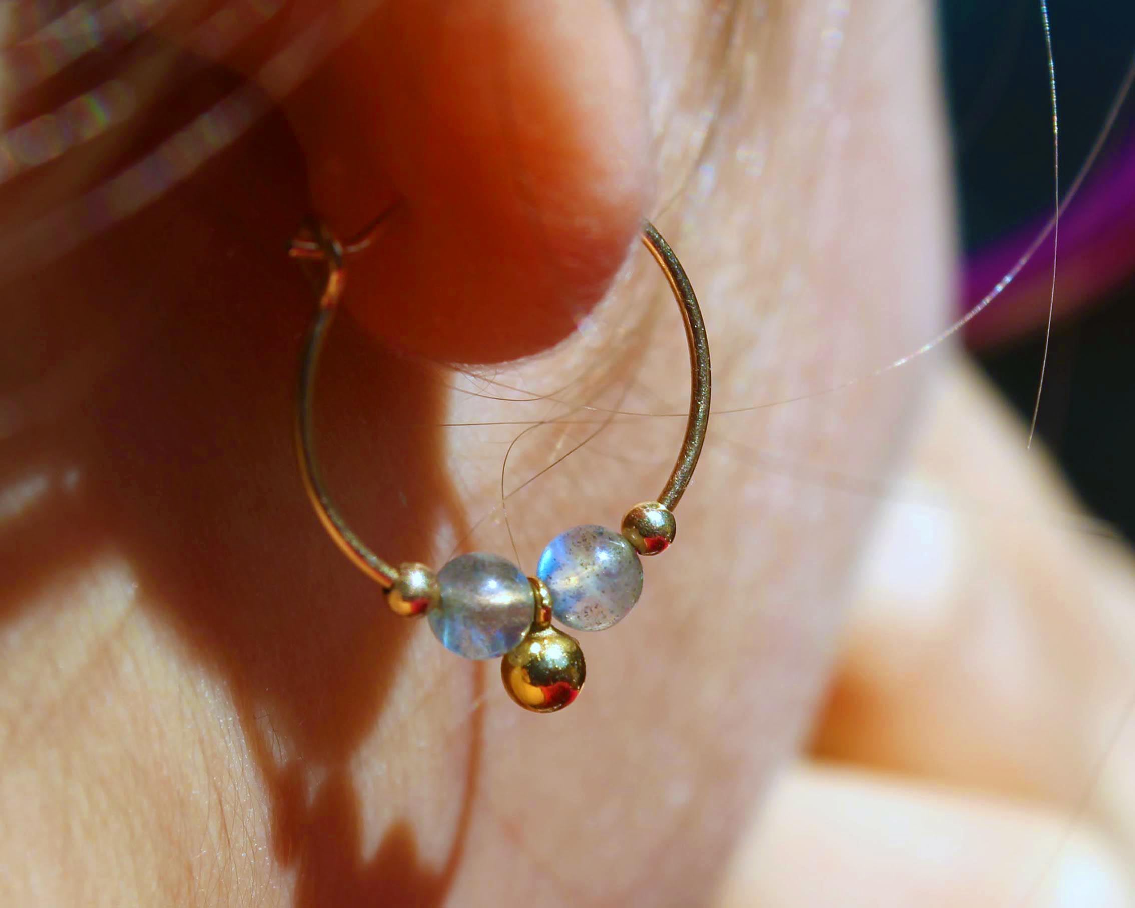 Náušnice o průměru 1,5 cm s minerály labradorit s barevnými odlesky pro labradorit typickými a nezaměnitelnými. Ostatní komponenty jsou z plněného/plátovaného zlata* 14kt.