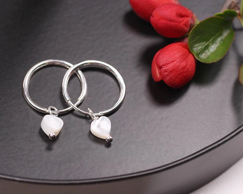Jednoduché stříbrné (925/1000) kruhové náušnice o průměru 14 mm s drobrými perleťovými přívěsky ve tvaru srdce.