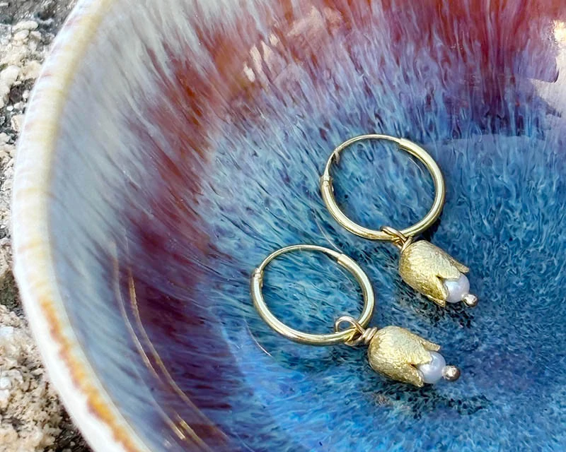 Rozkvetlé náušnice z pozlaceného stříbra 925/1000 o průměru kroužku 12-14 mm. Broušené květy s něžnými kultivovanými říčními perličkami. Zapnání náušnic je na pohyblivý drátek, který se po provléknutí uchem zasune do protilehlé duté trubičky.